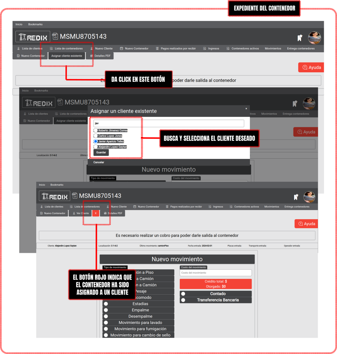 Nota: Si el contenedor esta vinculado con un cliente deberá aparecer un tache rojo en la parte superior del expediente del cliente. |