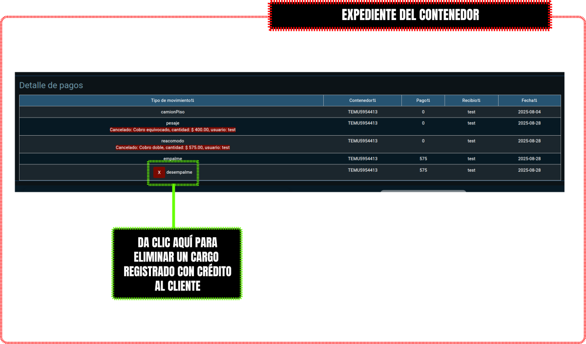 - Localiza el cargo que deseas eliminar en Detalle de pagos en la parte inferior del expediente del contenedor.