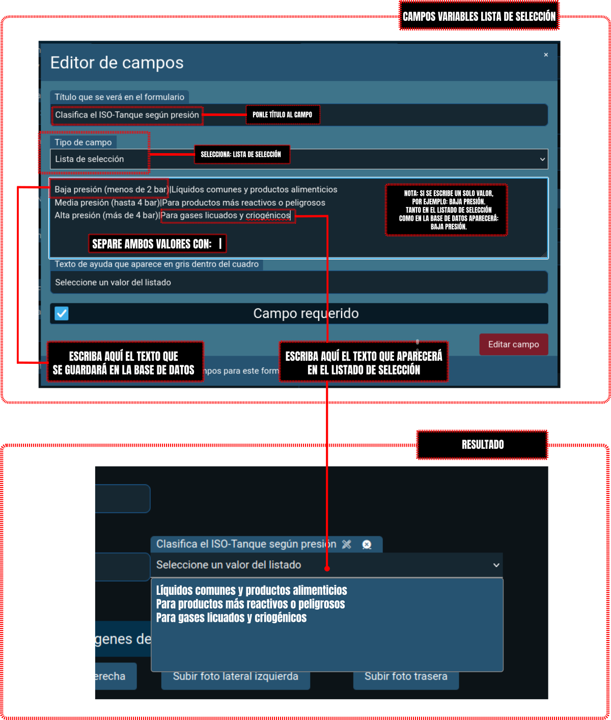 Si escoges "Lista de selección" aparecerá un nuevo campo donde deberás escribir el valor que se guardará en la base de datos y el texto que aparecerá en la lista de selección en el siguiente formato: