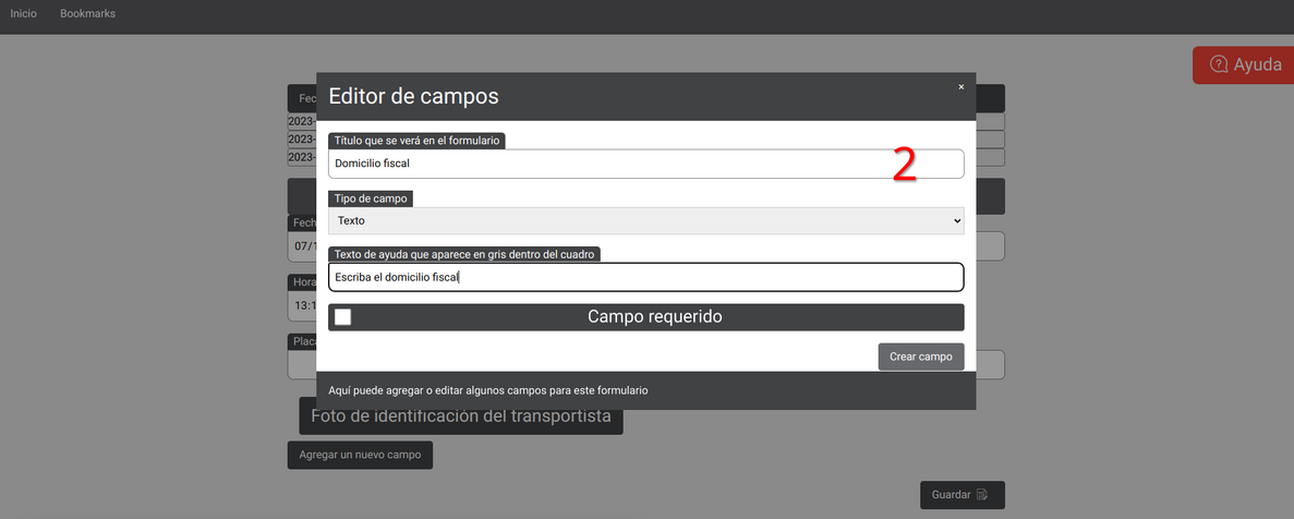 - Agrega: Título; Tipo de campo (numérico, fecha, hora, imagen o lista de selección); Texto de ayuda (aparece en gris dentro del recuadro) y si el campo es requerido o no.