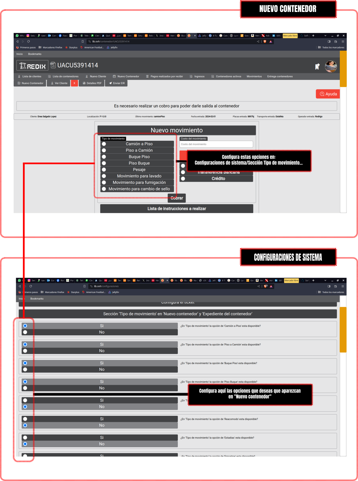 Activa los tipos de movimientos que manejas en tu patio de contenedores para que aparezcan en la sección de "Nuevo contenedor" y en el expediente del contenedor.