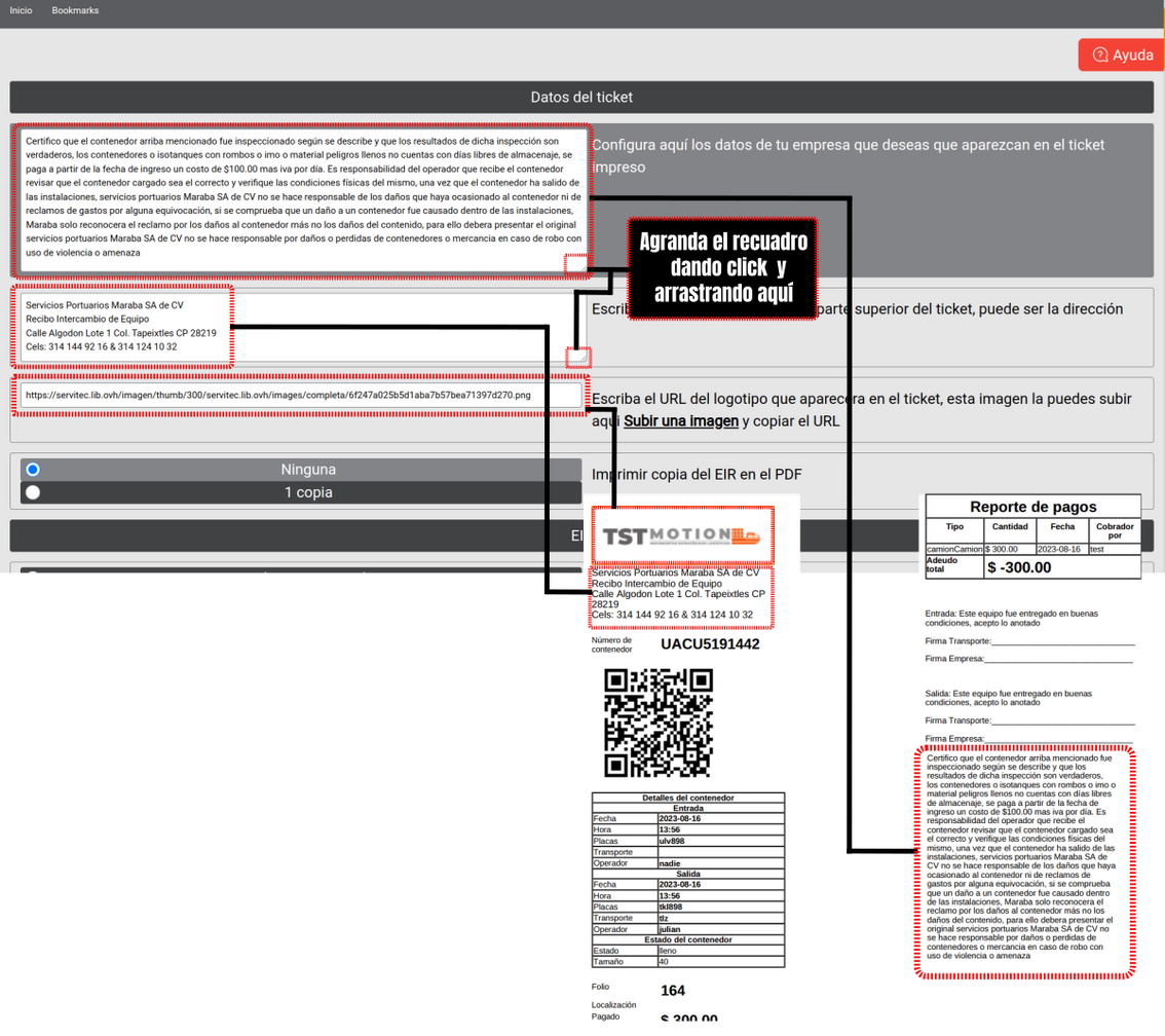 - Configura las opciones de Leyenda del ticket, Dirección de la empresa, Logotipo impreso, campos variables y datos de entrada y salida.