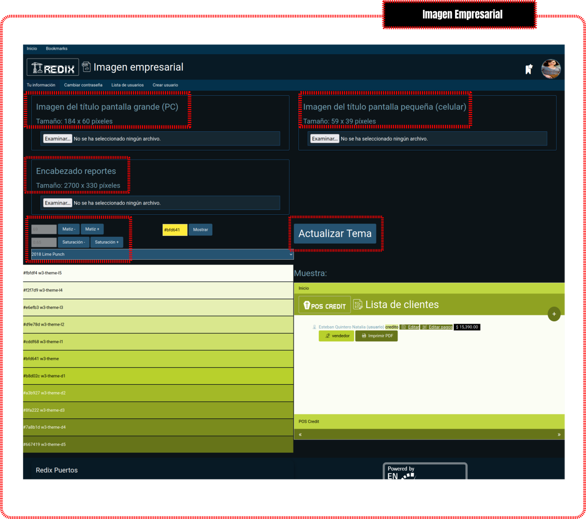 - Busca la opción de subir "Encabezado reportes", en esta opción debes subir la imagen que aparecerá en el encabezado de algunos reportes, por lo tanto, debes subir una imagen pequeña de un máximo de 2700 X 300 px, aquí si podrás jugar un poco con las dimensiones de la imagen para que quede como tu lo deseas.