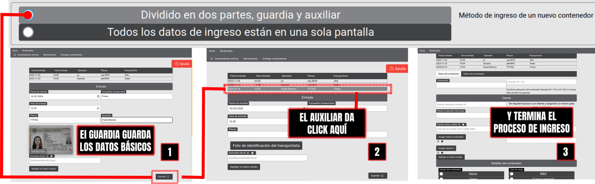 Si eliges la opción de "Dividido en dos partes, guardia y auxiliar" la interfaz de "Nuevo contenedor" se dividirá en dos partes de tal forma que el guardia de seguridad ingreso una serie de datos y una vez dentro el auxiliar llena los demás datos.