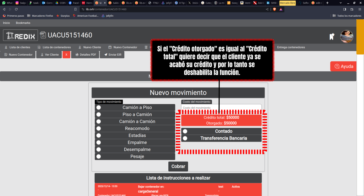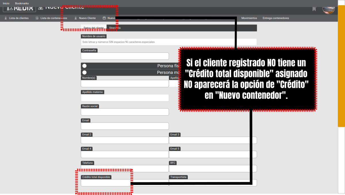 - No tiene un cliente asignado. Si el contenedor no tiene un cliente asignado, Redix no puede saber a quien cobrarle el crédito.