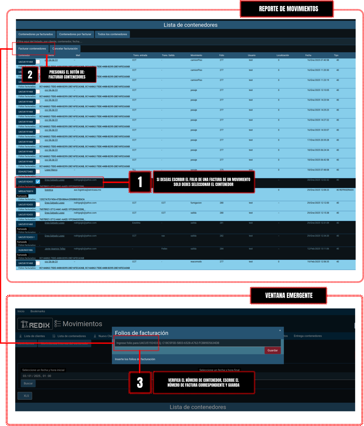- En la ventana emergente verifica el número de contenedor y escribe el número de factura.