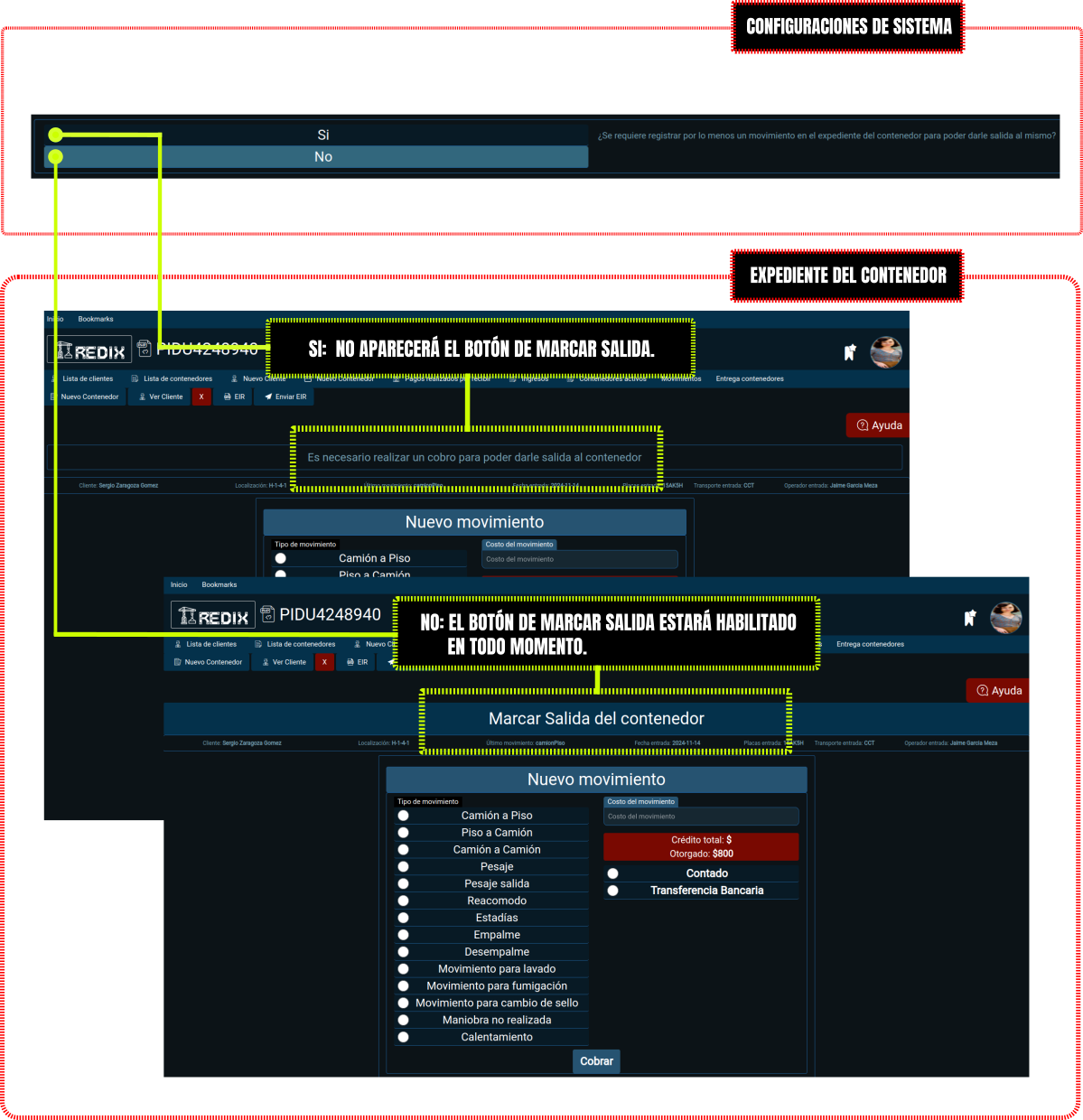- Si: Solo aparecerá la alerta de adeudos pero si te permitirá darle salida al contenedor.